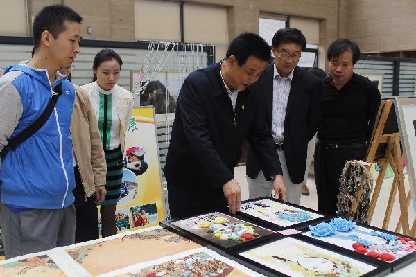 在展板前,校团委书记成瑶介绍了我校2014年暑期“三下乡”社会实践的基本情况和全校33支实践队的实践成果概况。幼儿师范学院“指尖上的关中”实践队指导老师王晶向领导们热情地介绍了这支队伍的实践过程,对学生们的作品进行了详细的讲解。
