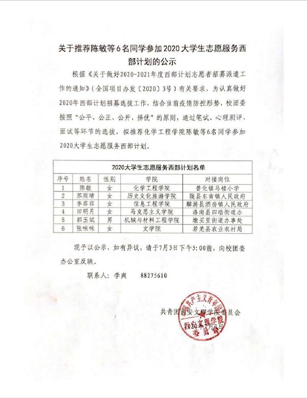 2020大学生志愿服务西部计划人员公示